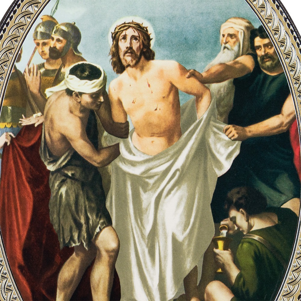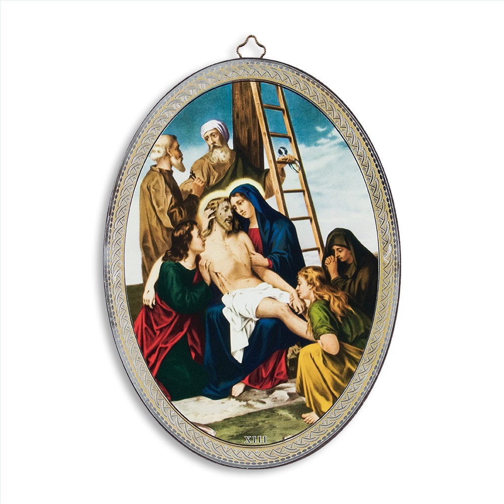Via Crucis set completo di 15 stazioni. Ogni quadretto è di forma ovale in legno laccato oro con la rappresentazione della Via Crucis. Queste graziose icone sacre sono lavorate a mano realizzata con lamina in argento e oro. Completi di gancini per poterli appendere alla parete e confezionati in scatola in plastica trasparente. Ogni quadretto misura 20 x 14,5 cm.