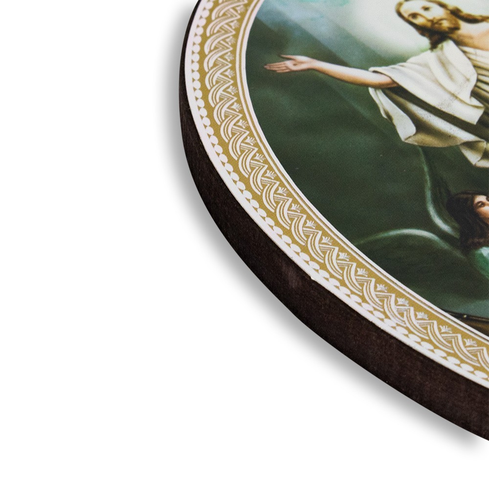 Ogni quadretto è realizzato artigianalmente in legno. Le icone sono di forma ovale in legno laccato oro con la rappresentazione della Via Crucis. Sono lavorate a mano arricchite con lamina in argento e oro. Ogni quadretto è completo di gancino per poterlo appendere alla parete e confezionato in scatola in plastica trasparente.