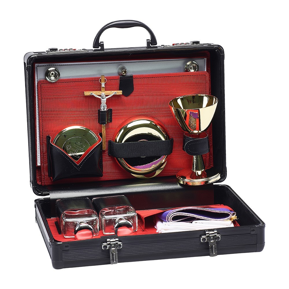 Valigia modello "Missione", realizzata in guscio in alliuminio e legno lamellare rivestito. La valigetta è dotata di chiusura di sicurezza e di un comodo manico. Completa di tutto il necessario per la celebrazione in diversi luoghi come all'aperto, in capelle etc.