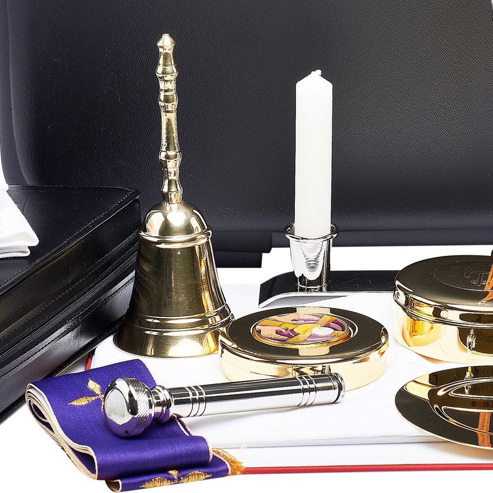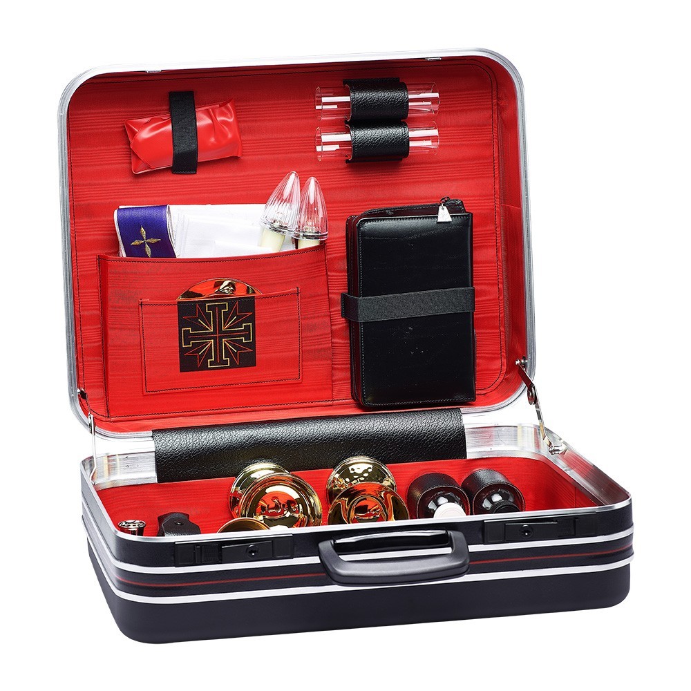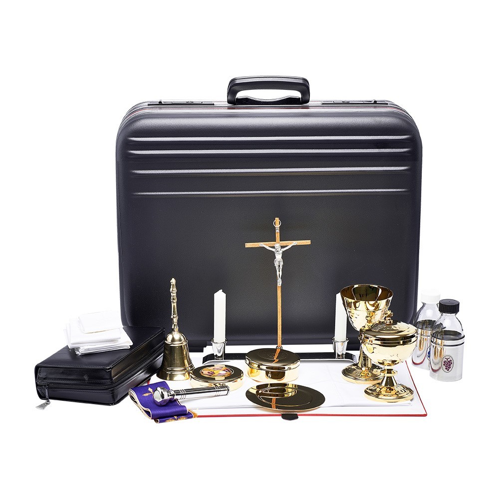 Contiene una vasta gamma di accessori: il campanello, tre oli santi in custodia che possono essere estratti e usati a parte, scatola per particole e scatola per ostia magna, le tovaglie ricamate, stoletta, altarino, antivento, candele, calice h 14 cm, pisside con coperchio e base lavabile per appoggio. Inoltre sono incluse le bottiglie con corazza e lunetta fermaparticole per le celebrazioni all'aperto. Contiene anche la custodia per breviaro. La valigetta volendo può contenere anche paramenti voluminosi.