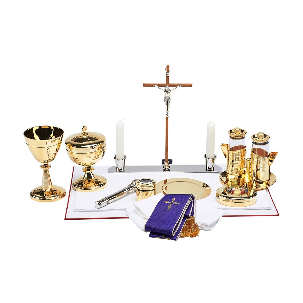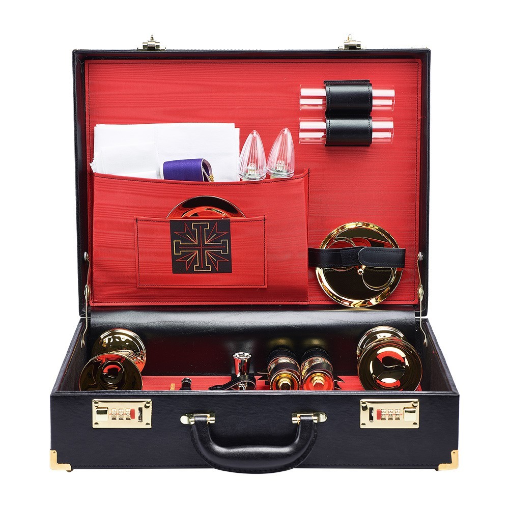 La valigetta è dotata di serratura a combinazione, ampolline a chiusura ermetica, altarino mobile, calice e pisside di alta qualità, 5 tovaglie ricamate, stoletta bicolore, vasetto oli santi dorato, scatola per particole dorata con placca argentata, paravento in pyrex, base lavabile per celebrare, lunetta ferma particole per celebrazioni all'aperto. Questa bellissima valigia è completa di metalli di ottima fattura e funzionali, studiati per la praticità oltre che per l'estetica.