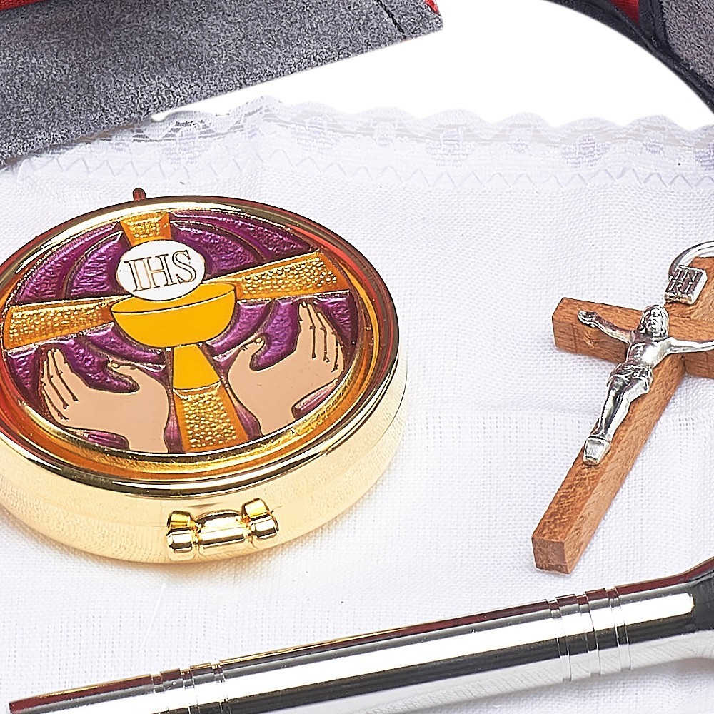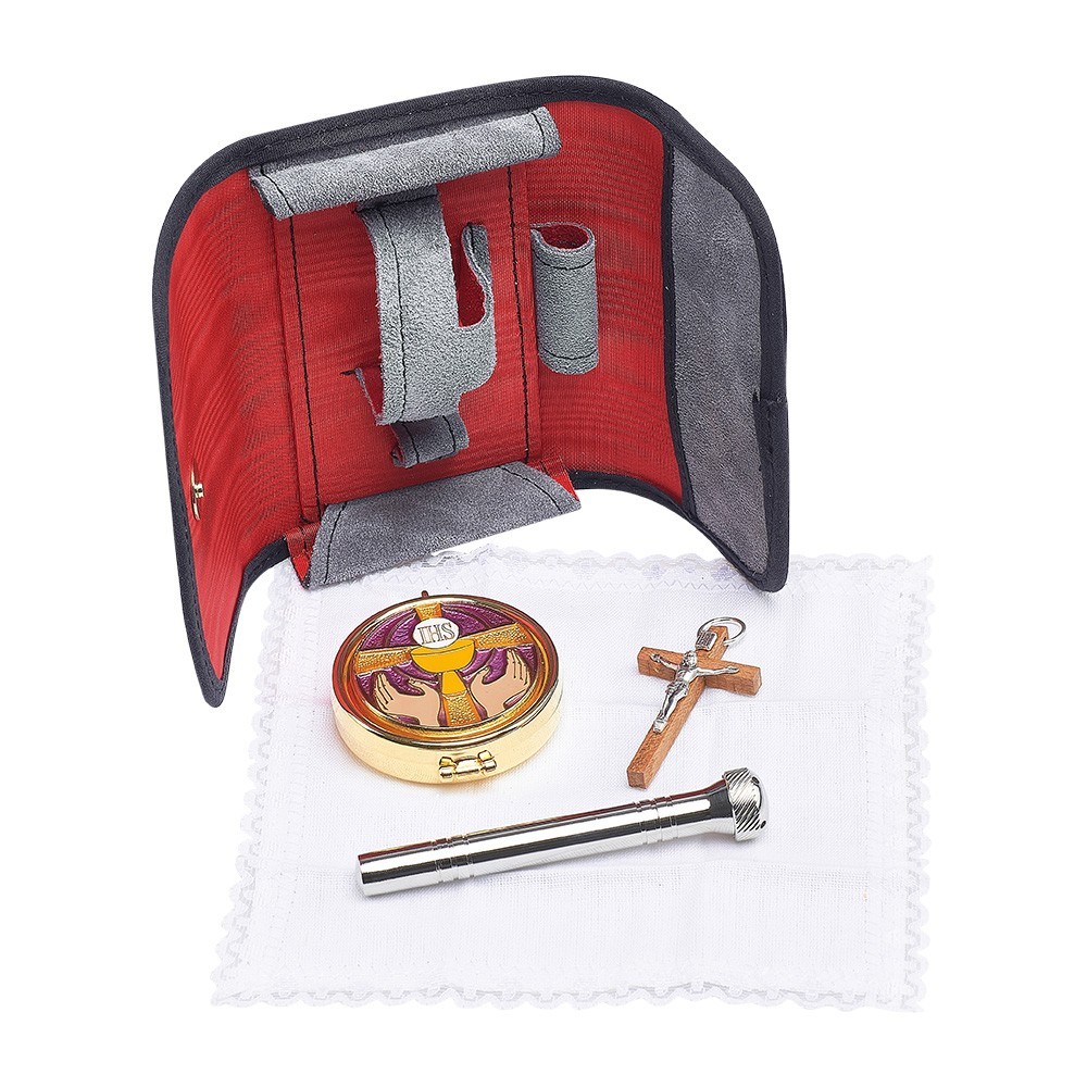 Portateca con teca, piccola croce e purificatoio.