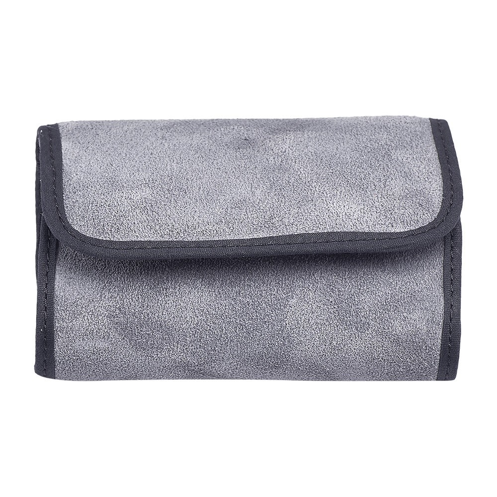 Borsellino in semilpelle scamosciata di colore grigio. Un comodo ed elegante borsello completo di aspersorio, teca smaltata, purificatoio e piccola croce.