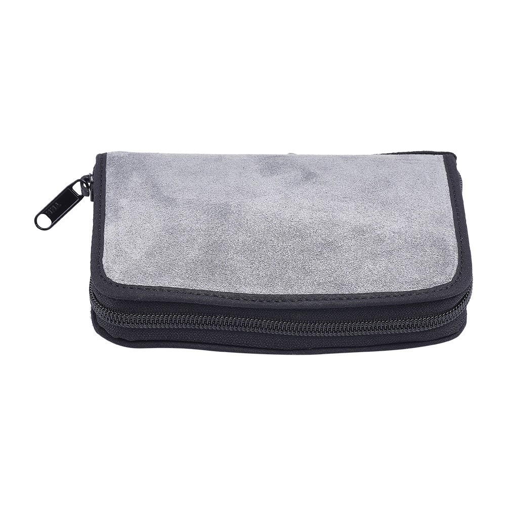 Viatico modello Portafoglio con chiusura a cerniera realizzato in scamosciato di colore grigio. Produzione italiana.