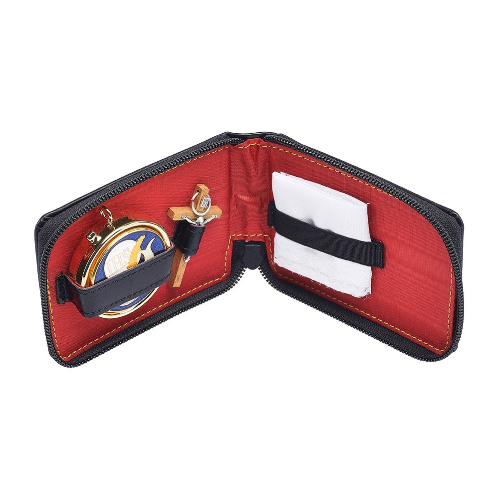 Astuccio portaviatico modello Portafoglio in pelle nera di vitello, completo di chiusura a cerniera. Contiene tutto il necessario per portare la comunione agli Infermi.
