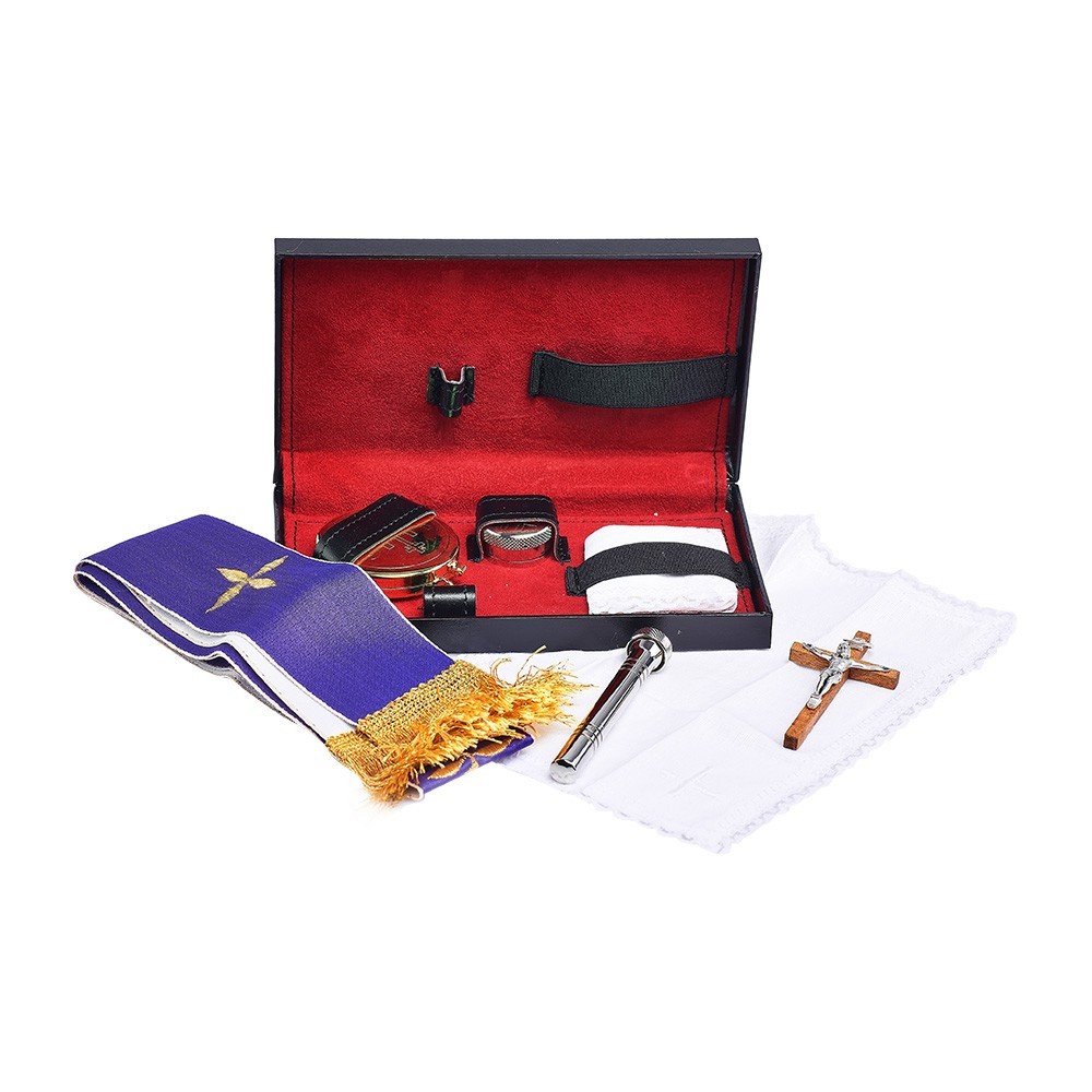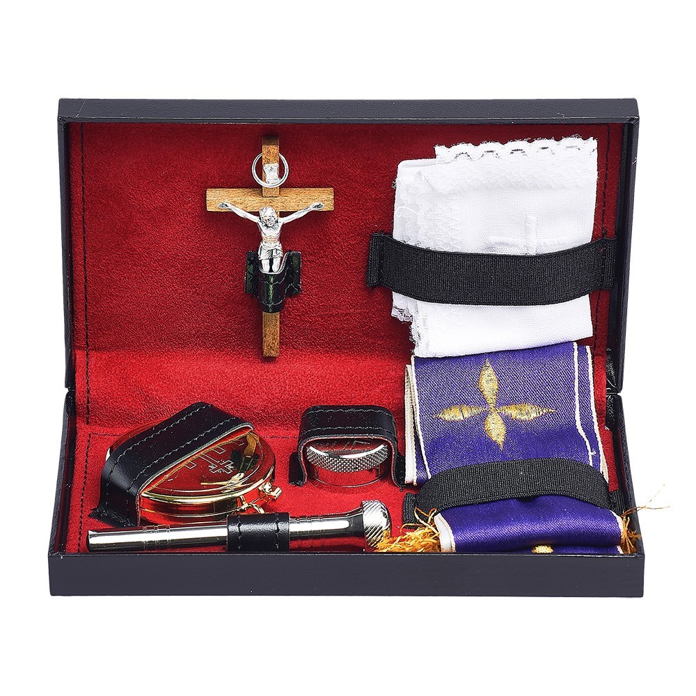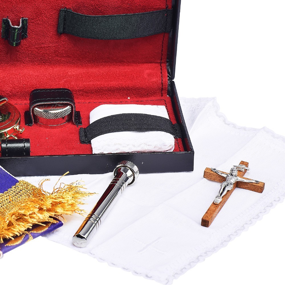 Cofanetto per viatico con chiusura a scatto. Il cofanetto è rigido di colore nero e interno in tessuto rosso. Misura 18x10,5x3,5 cm.