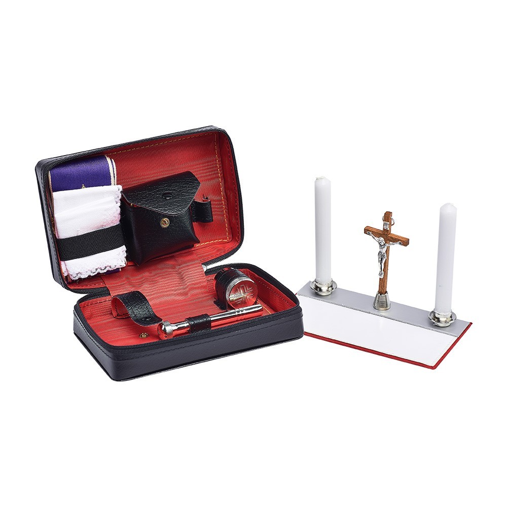 Cofanetto per viatici, completo di altarino e portateca. Realizzato in pelle nera tipo foca. Dimensioni