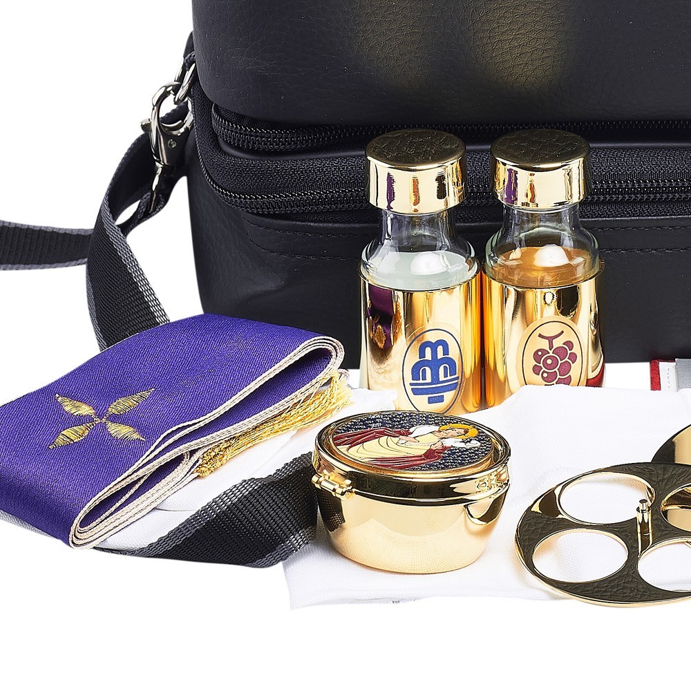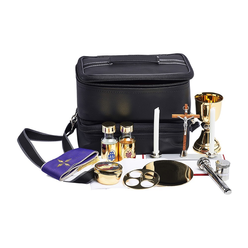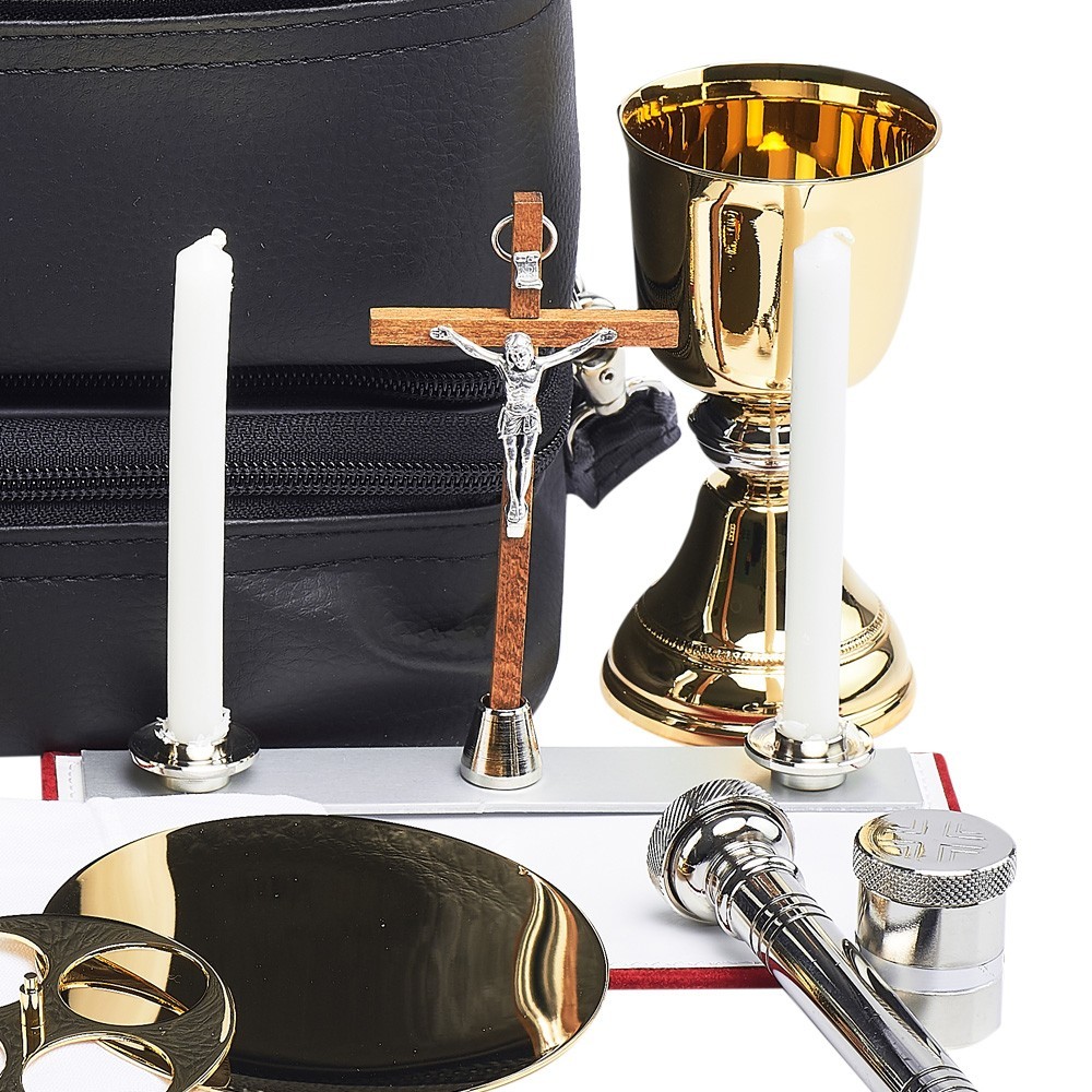 Contiene tutto il necessario per la celebrazione, calice, bottiglie acqua e vino, aspersorio, vasetto per oli sacri, teca alta, patena, altarino completo di crocifisso, candele, stola e coppia di tovagliolini.