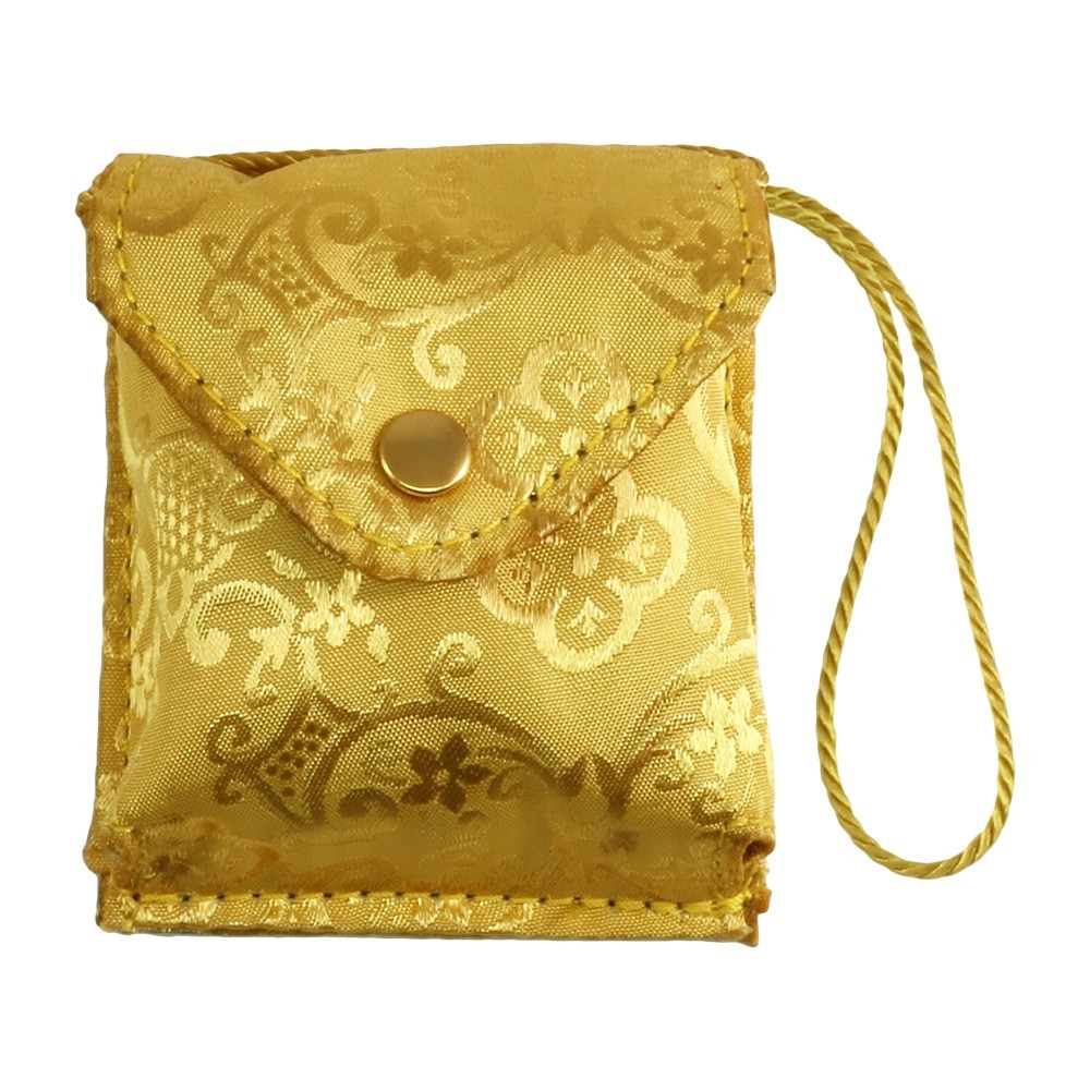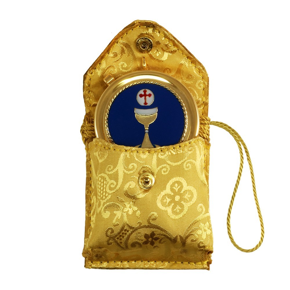 Astuccio portateca in tessuto jacquard dorato con cordino. Il portateca è completo di teca eucaristica in ottone dorato 24 carati con placca decorativa (diametro 5 cm).