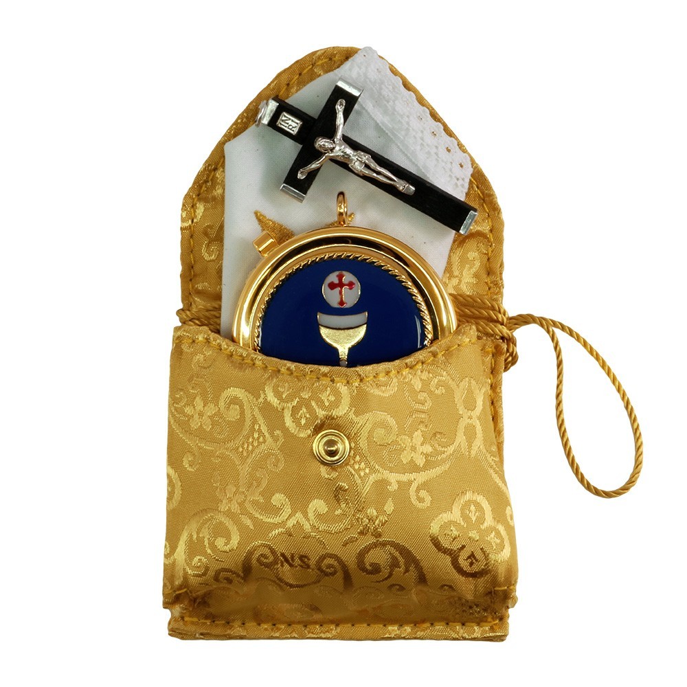 Astuccio portaviatico in raso con scatola portaostie, croce e purifichino.