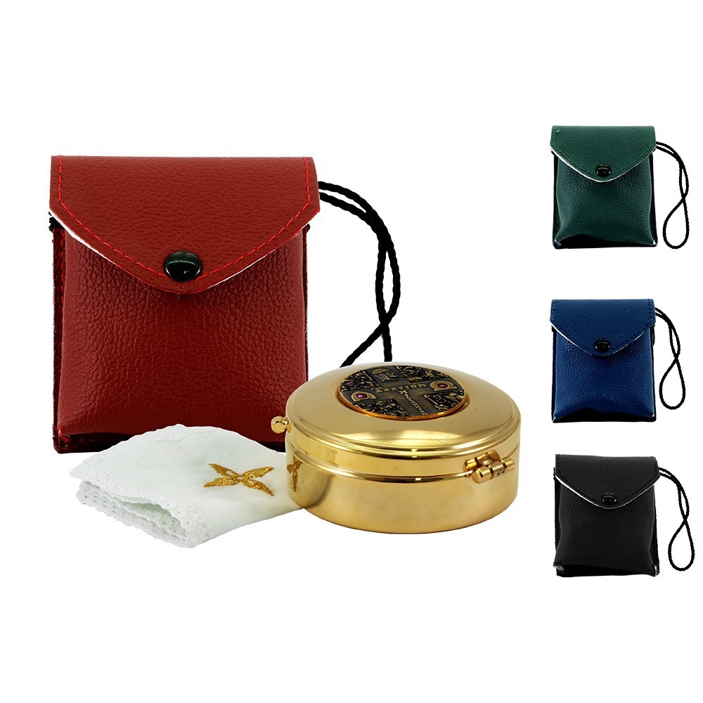 Astuccio porta viatico con scatola porta ostie e cordino coordinato. La custodia è interamete in vera pelle, misura 9x11 cm.