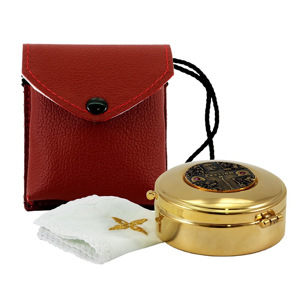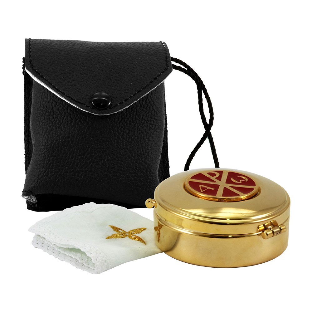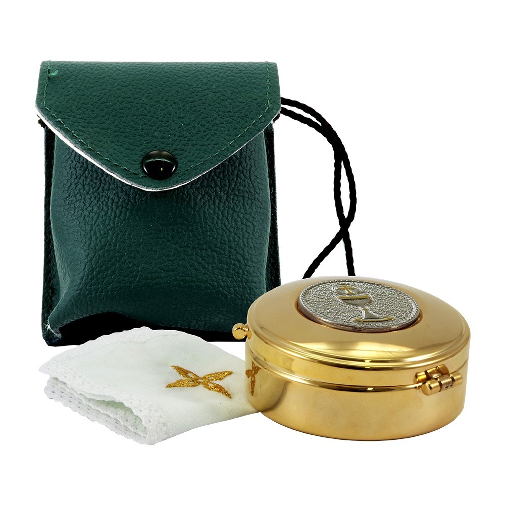 Sacchetto con teca, patena, croce e purifichino, misura 9x12 cm.