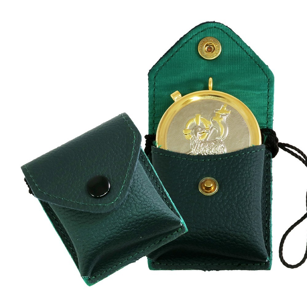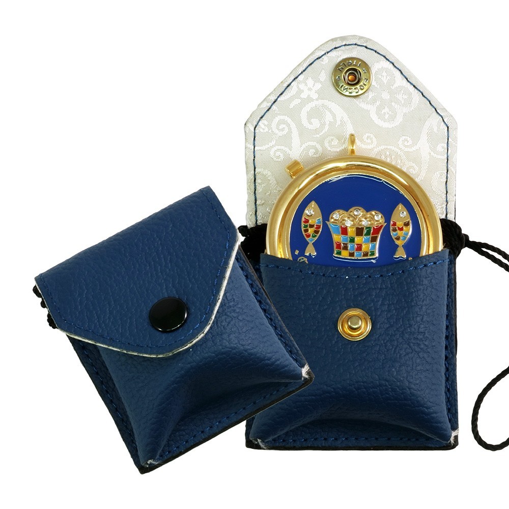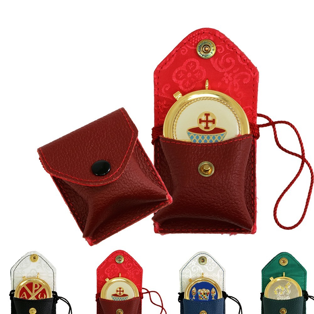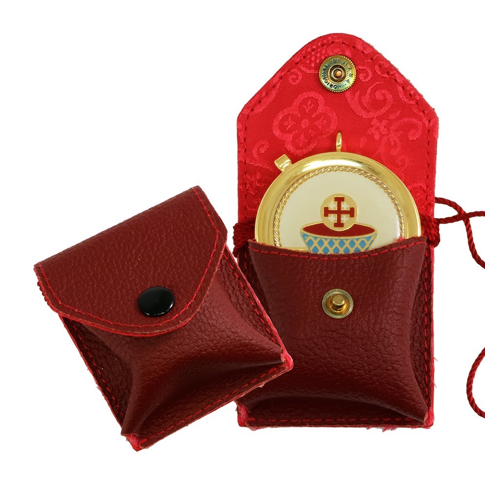 Astuccio portateca in vera pelle con cordino, completo di teca eucaristica in ottone dorato 24 carati conplacca decorativa smaltata a mano.