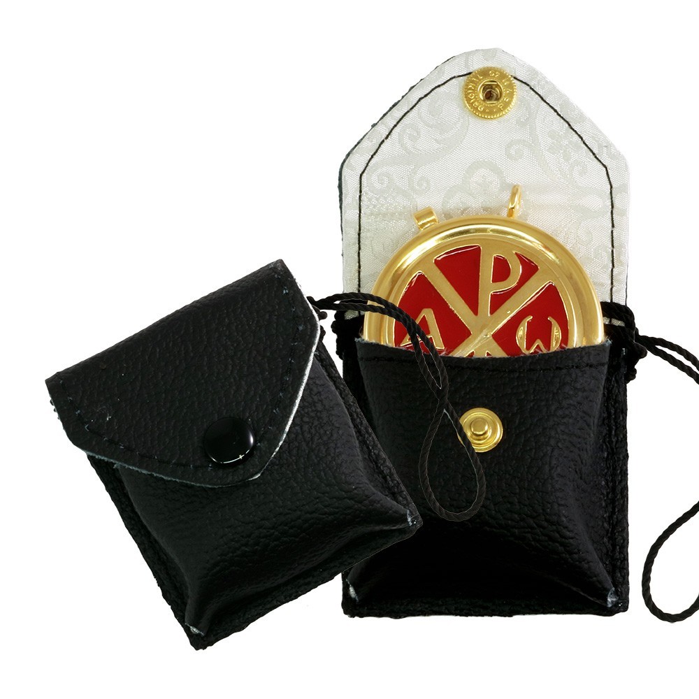 Portateca in pelle con teca eucaristica in ottone, misura 6,5x7 cm.