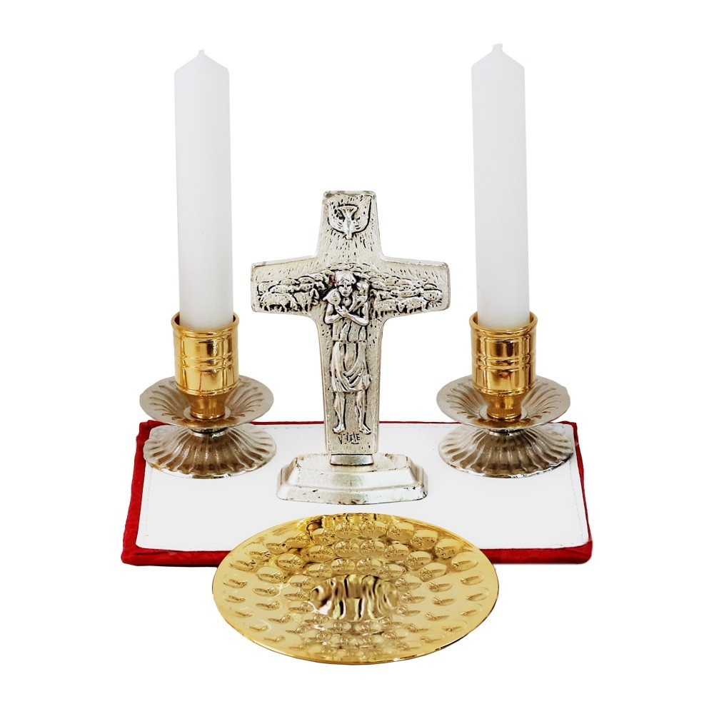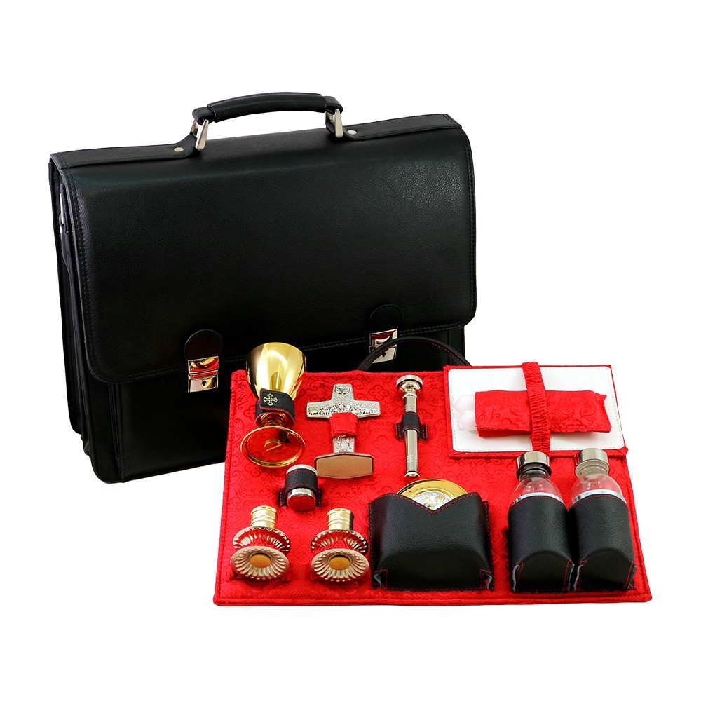 Elegante cartella in pelle nera ecologica con tracolla, interno completamente foderato in raso rosso lavorato con telaio Jacquard. Il pannello porta oggetti è completamente estraibile e contiene tutto il necessario per la celebrazione. Al suo interno vi è la Croce del Buon Pastore.