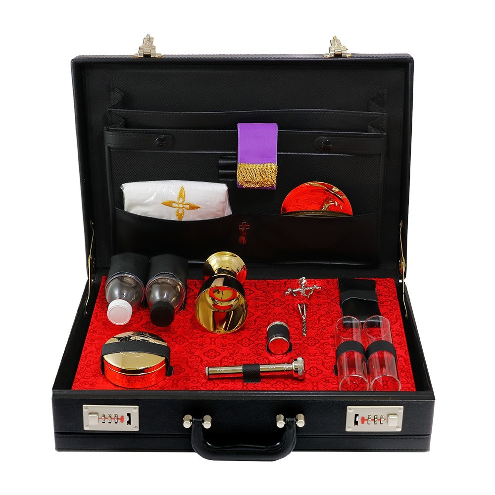 Elegante valigetta in pelle nera ecologica con chiusura a combinazione. Dotata di pannello porta oggetti estraibile, foderato in raso rosso. Contiene tutto il necessario per la celebrazione.
