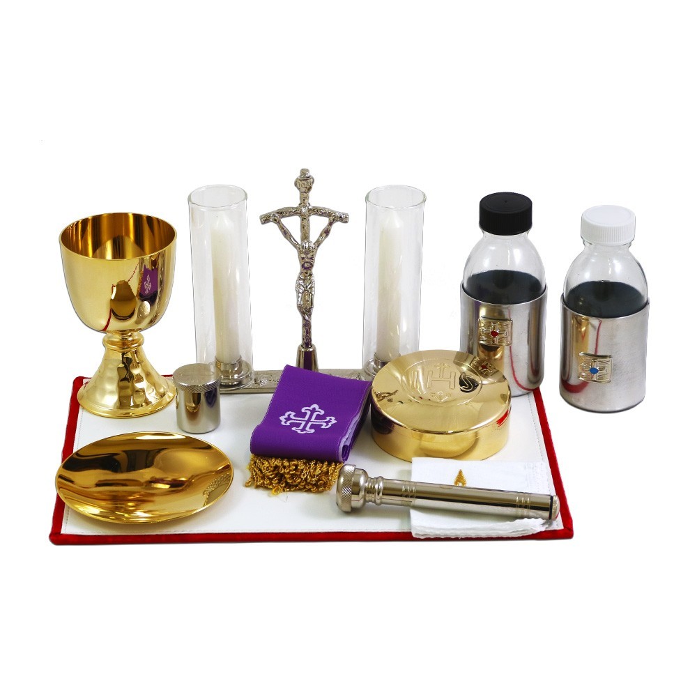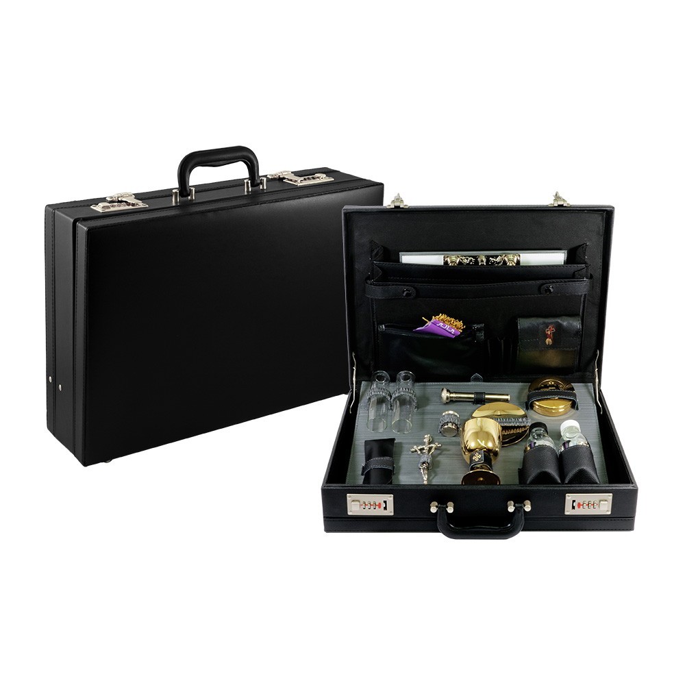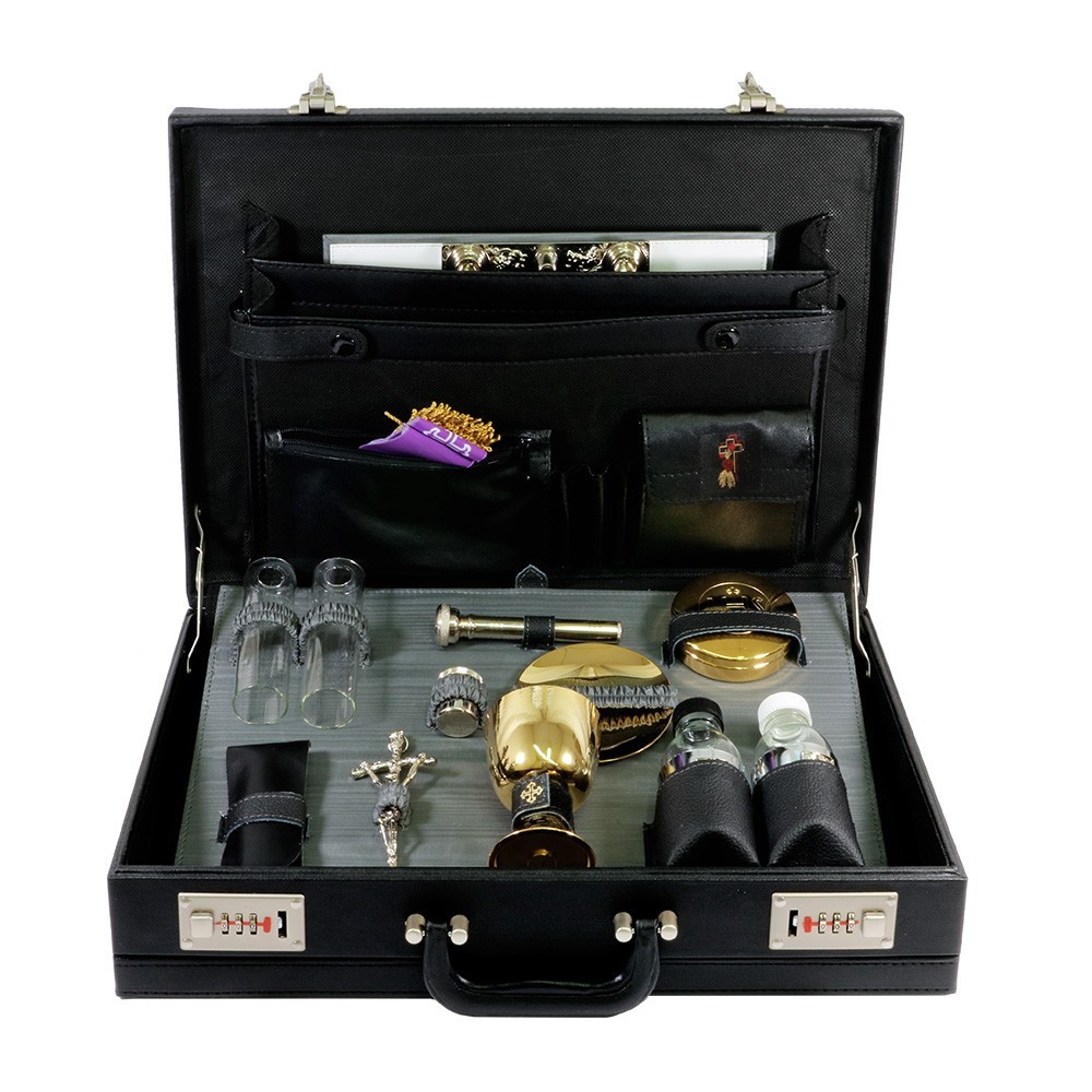 Elegante valigetta con chiusura a combinazione. Dotata di pannello porta oggetti estraibile, foderato in raso grigio. Contiene tutto il necessario per la celebrazione.