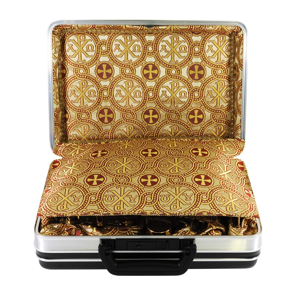 Pregiata e elegante valigia per celebrazioni in ABS, materiale estremamente resistente agli impatti. L'interno della valigetta è foderato in tessuto broccato finemente decorato,