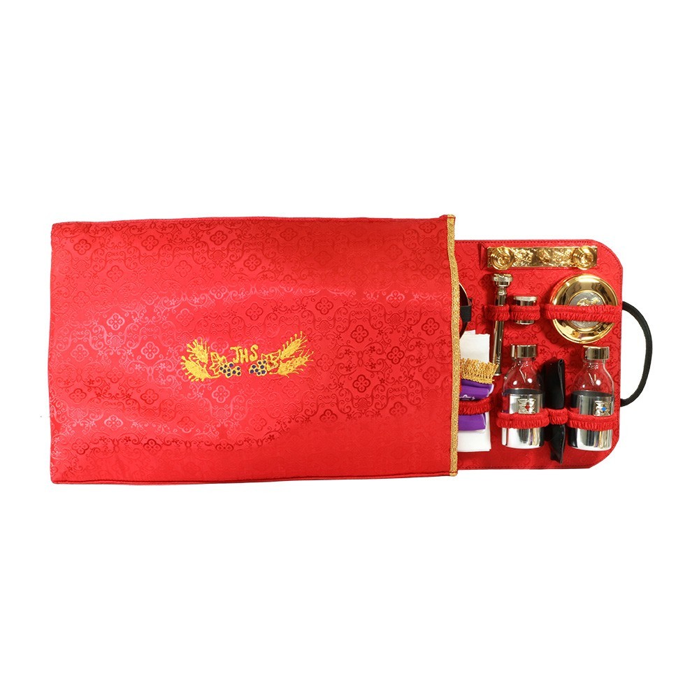 Trolley da viaggio contenente tutto il necessario per la celebrazione. Dotato di 4 ruote e di pannello portaoggetti estraibile foderato in jacquard rosso.