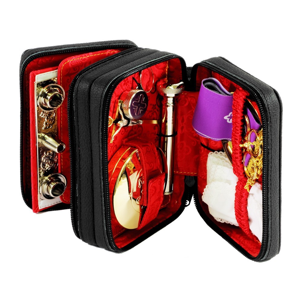 Il borsello è dotato di tracolla ed è completo di tutto l'occorrente per la celebrazione. Realizzato e rivestito in vera pelle con interno foderato in jacquard rosso.