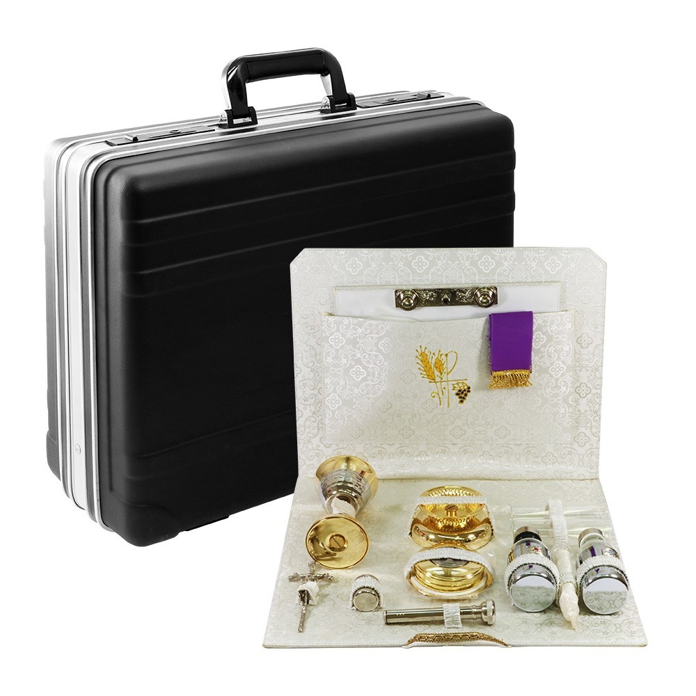 Pratica e leggera valigetta in Abs per la celebrazione della Santa Messa. Adatta sia per la celebrazione che per il viatico. Con interni interamente foderati in tessuto lavorato in jacquard bianco, dotata di pannello porta oggetti estraibile.