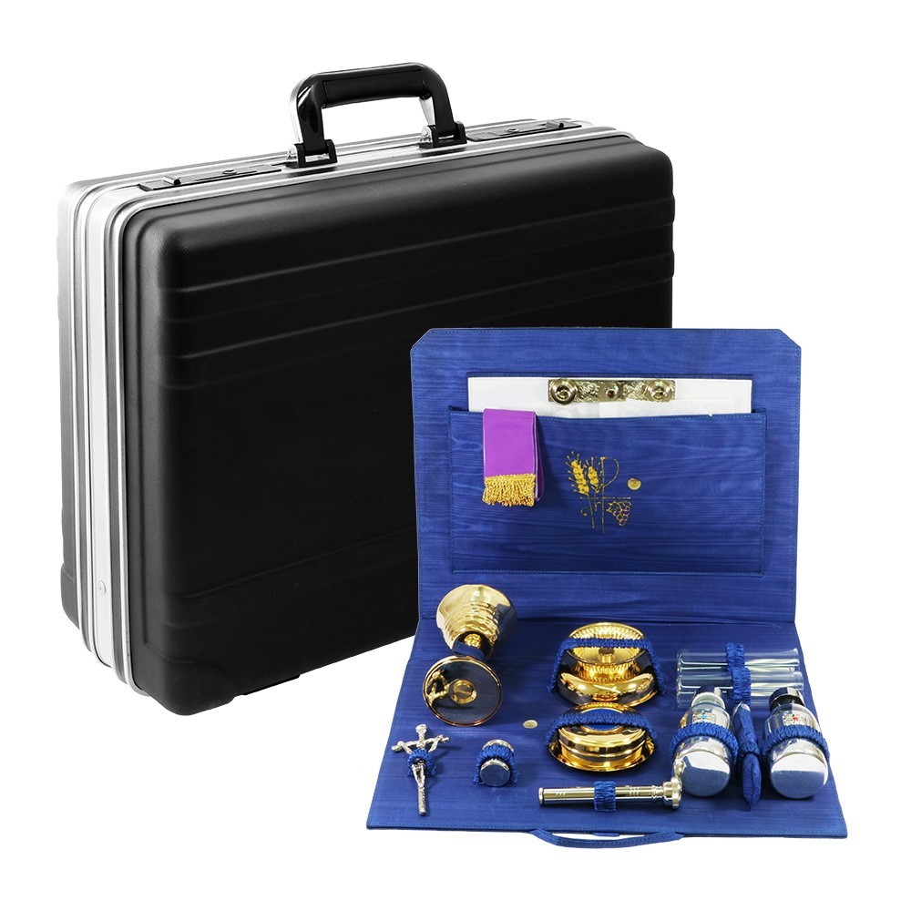 Leggera e elegante valigetta in Abs per la celebrazione della Santa Messa. Adatta sia per la celebrazione che per il viatico. Con interni interamente foderati in jacquard blu. Completa di pannello porta oggetti estraibile.