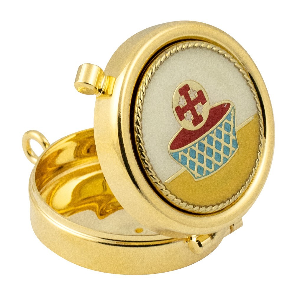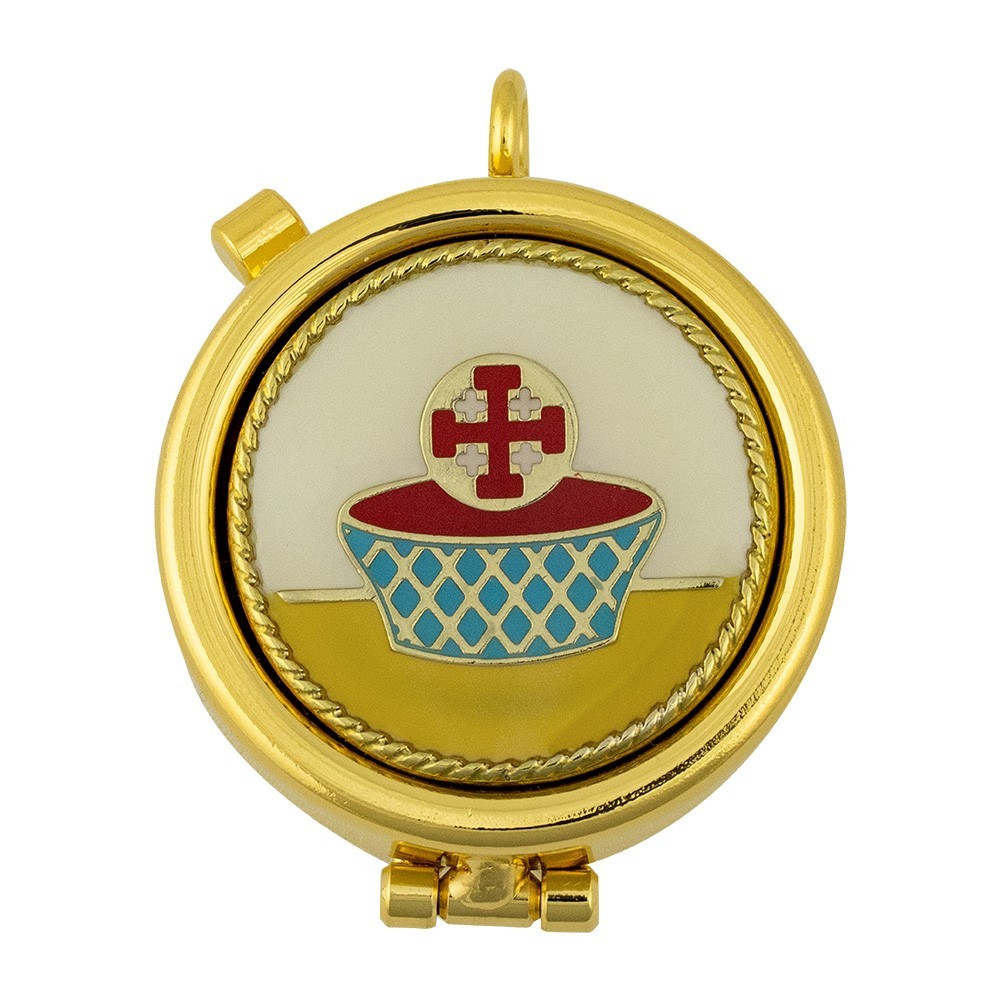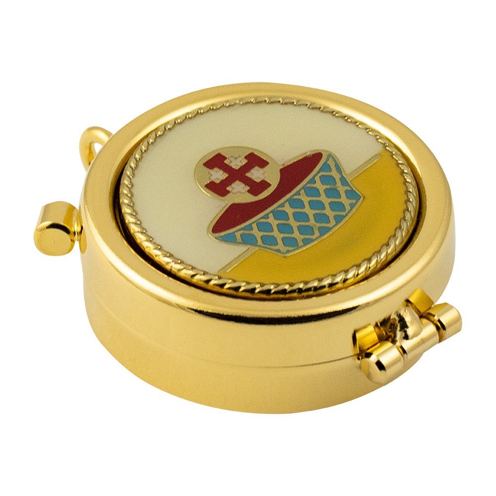 Pratico astuccio porta viatico per sacerdote. Realizzato in pelle ecologica con inserti in oro. E' di colore bianco e oro all'esterno e di colore oro all'interno. Questo grazioso viatico contiene piccola croce in metallo, teca in ottone smaltata, purifichino. Misura astuccio Ø 10 cm. Produzione made in Italy.